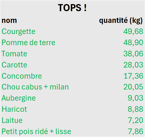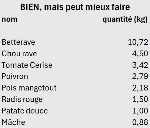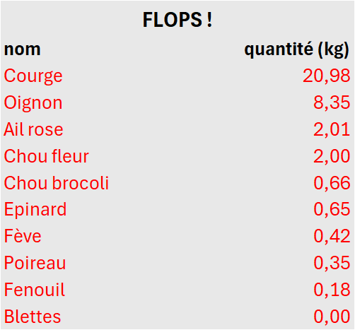 - en rouge : les « flops », là où je suis déçue des quantités récoltées