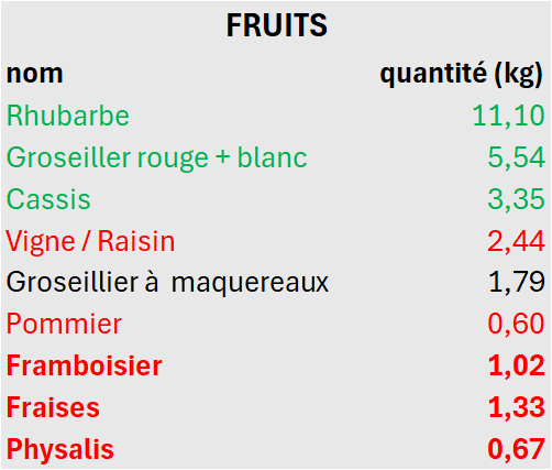 Concernant les autres chiffres, ils ne sont pas très importants. Je note en bio, au prix réel du magasin où j’achetais avant d’avoir autant de récoltes. Mais en vérité, je n’achèterais jamais plusieurs kilos de groseilles par exemple, donc on regarde surtout les kg !